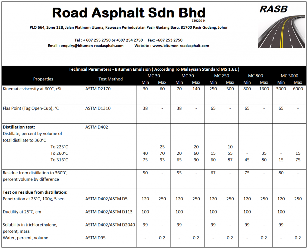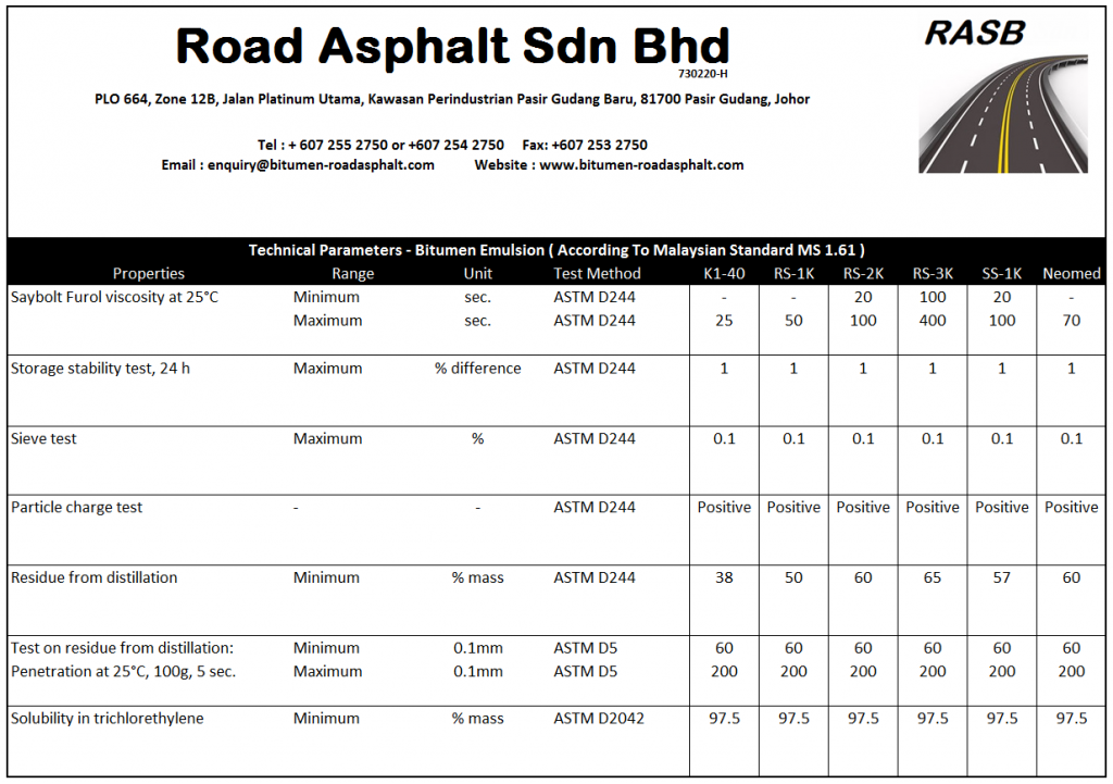 RASB maintain products technical parameters according to Malaysian Standard MS 1.61 for bitumen emulsion and Malaysian Standard MS for cutback asphalt. RASB technical parameters contain complete information in properties, unit of measurement and test method as well. You are most welcome to contact us for more details.